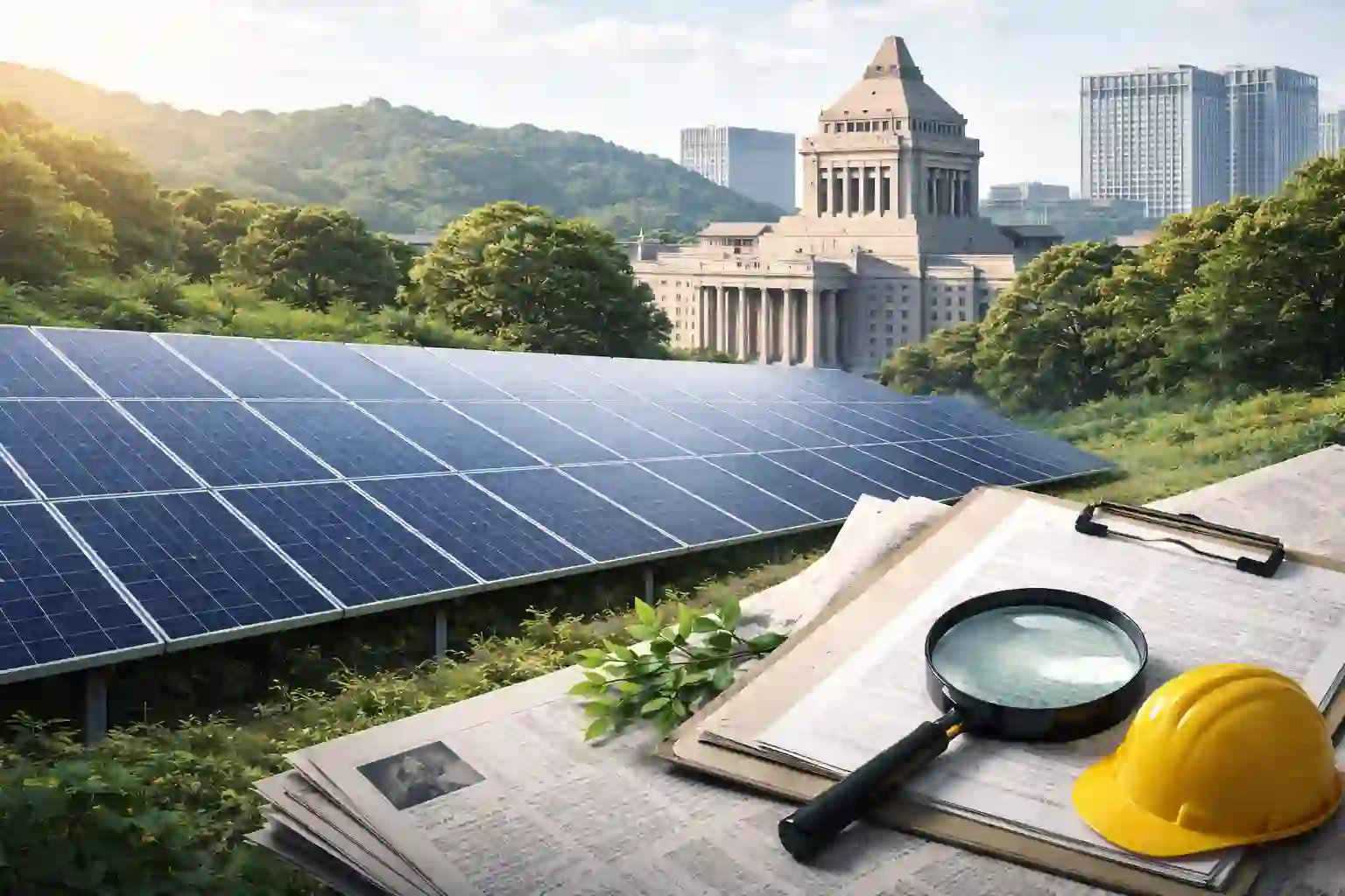 ニュースでは「メガソーラー」「環境破壊」「森林伐採」「災害リスク」という言葉が取り上げられ、国会でもメガソーラーに対する法規制が議論されています。