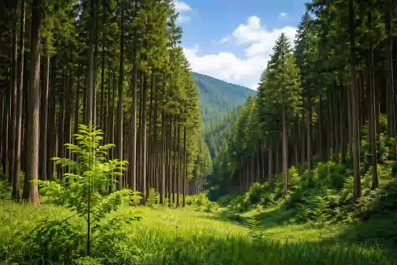 若木と成木が混在するスギ林に差し込む光